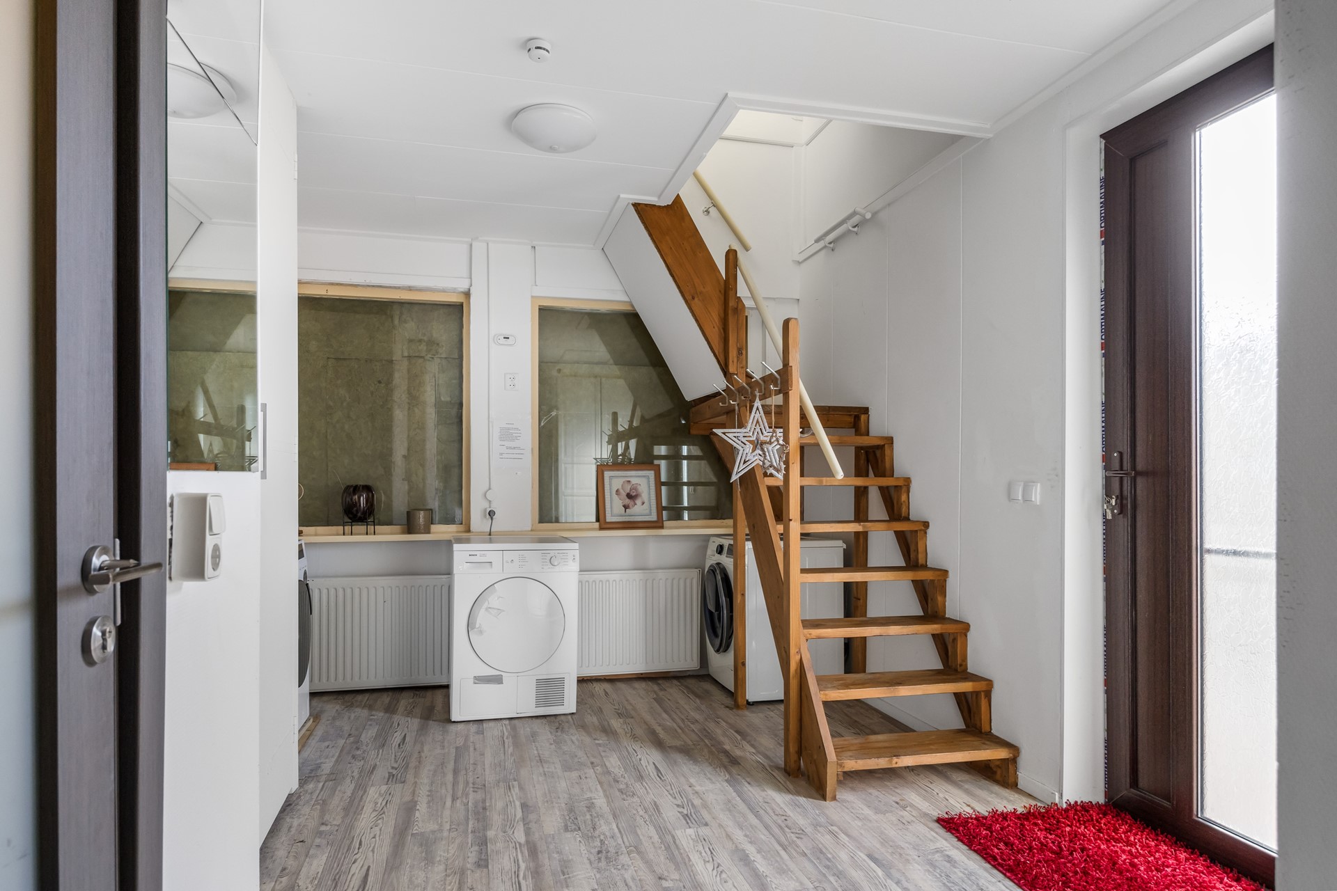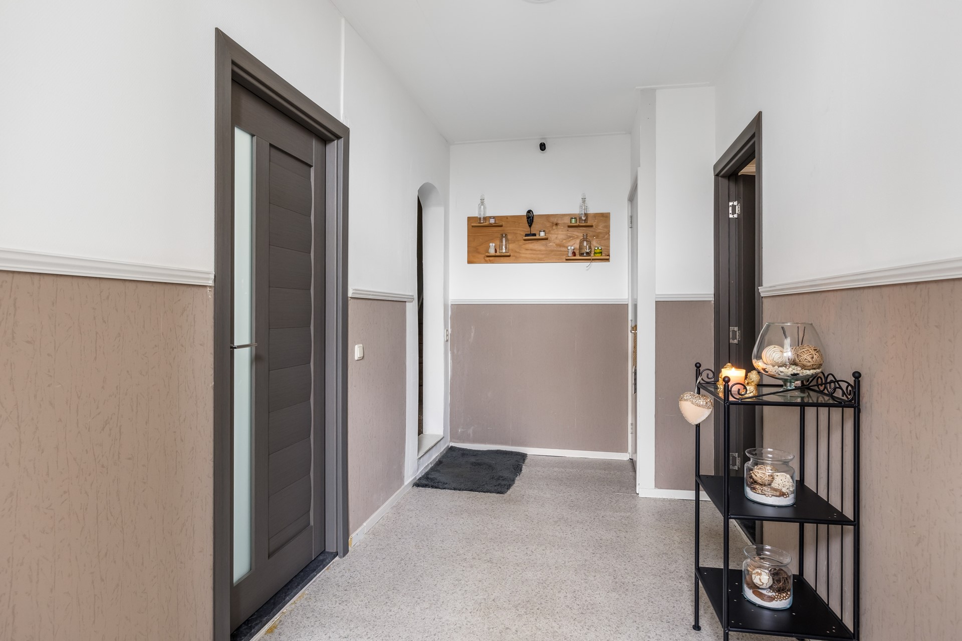 Begane grond: Entree, hal met meterkast, gezelschap of hobbyruimte, twee slaapkamers, toilet, witgoedruimte, cv-ruimte. woonkamer, luxe open keuken voorzien van inductie, afzuigkap, vaatwasser, oven, koelkast, nieuwe badkamer, slaapkamer.