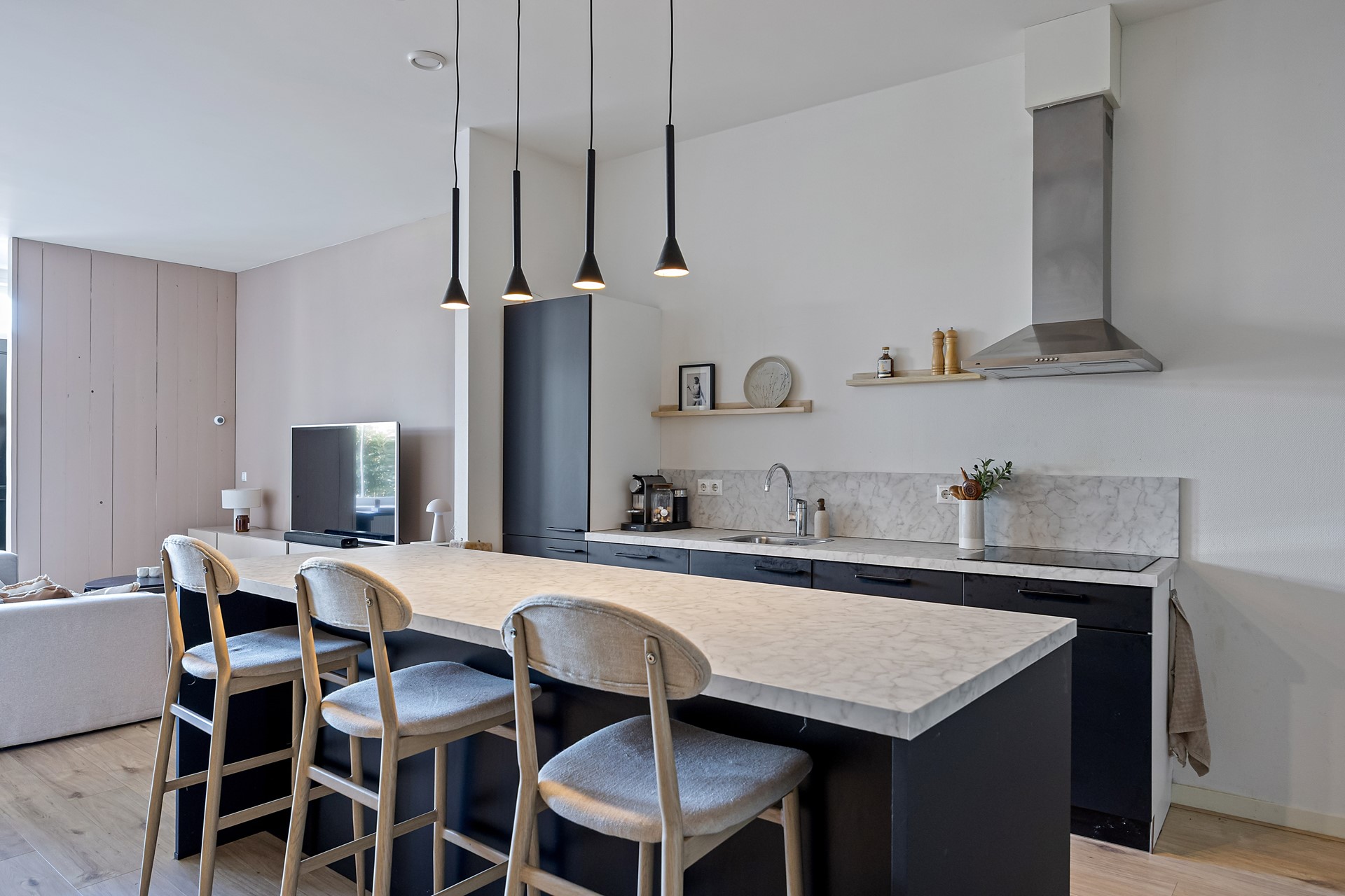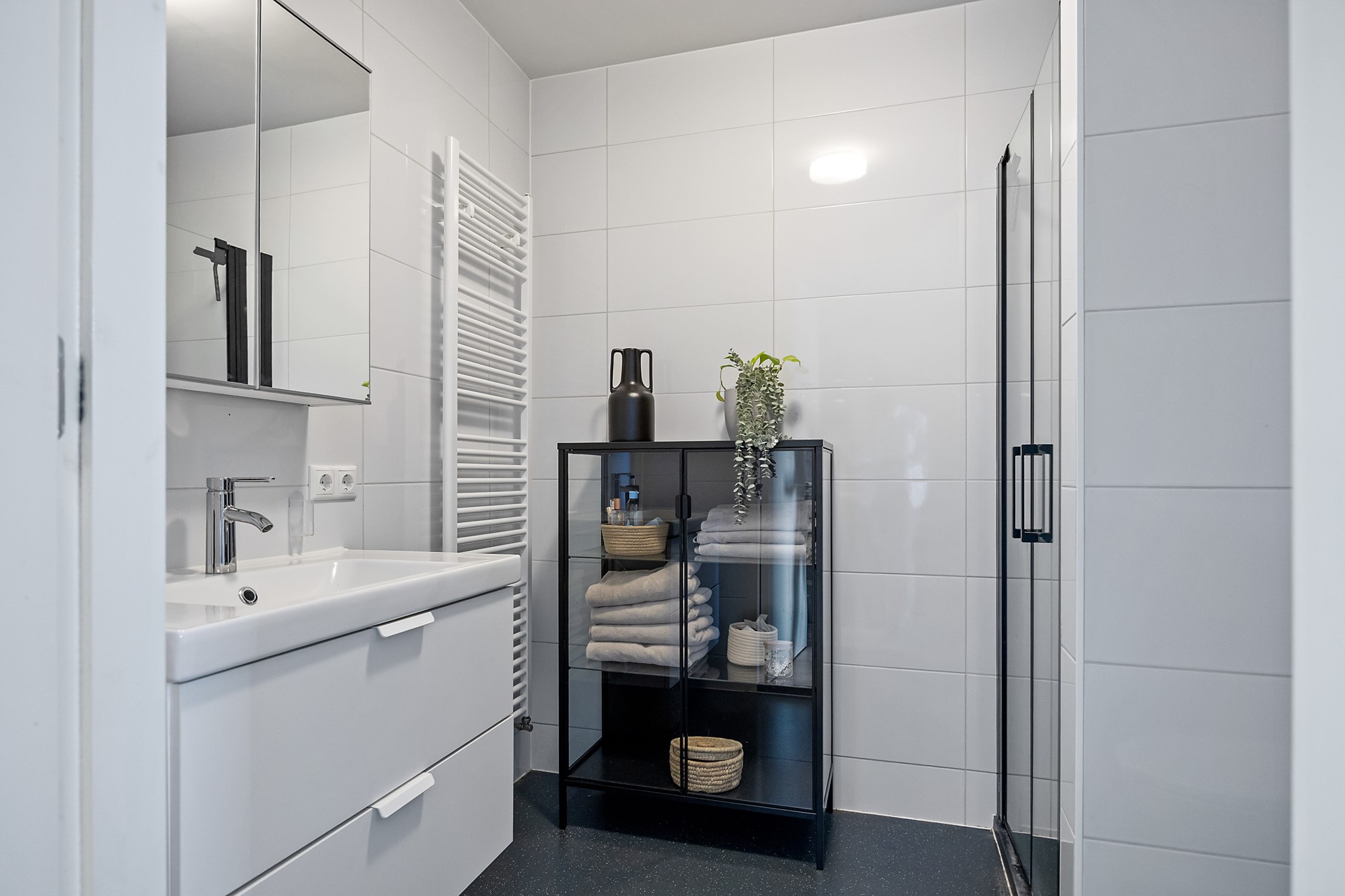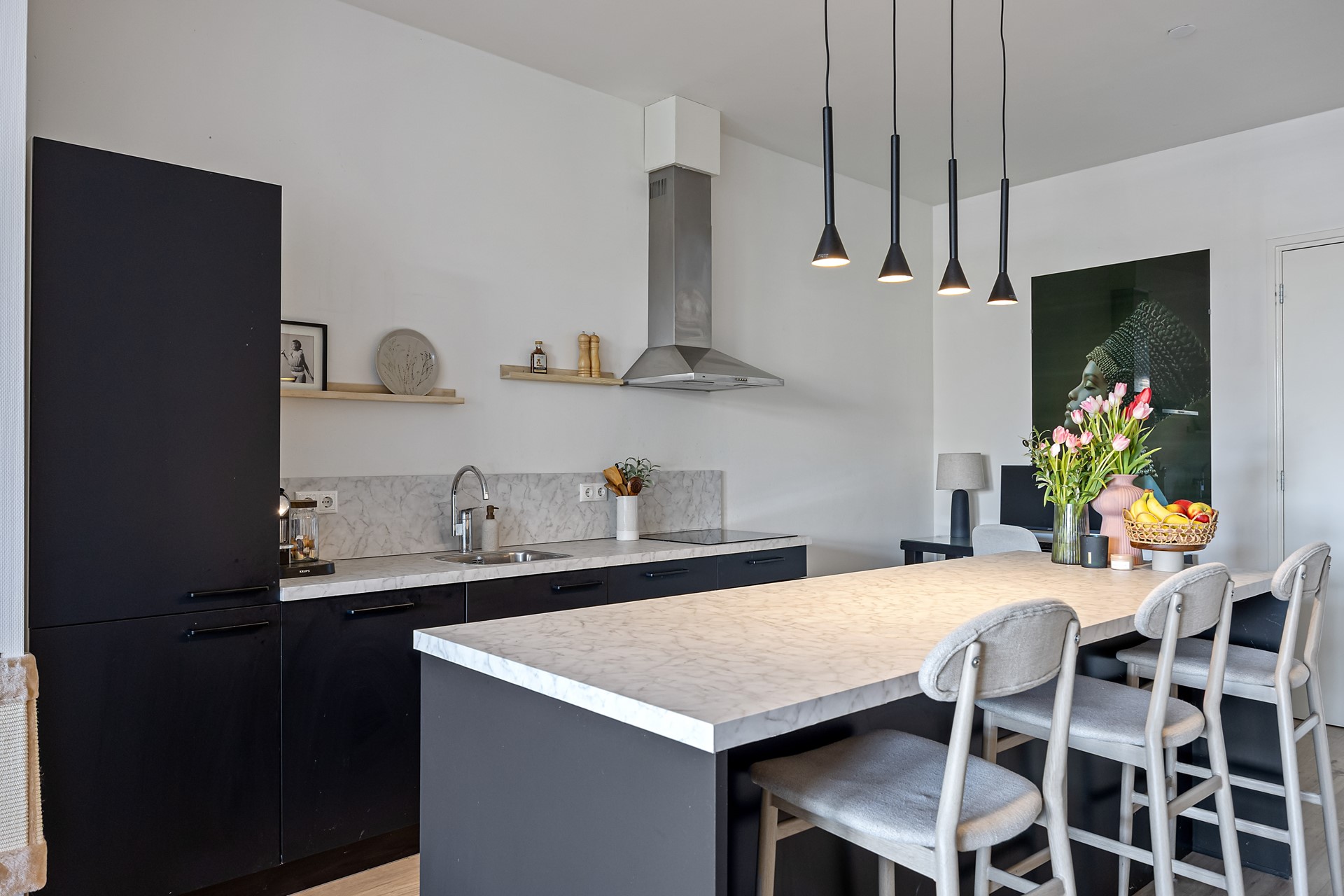 Entree, hal met meterkast, garderobe en cv-ruimte, woonkamer, open keuken met inductie kookplaat, afzuigkap, koelkast, vrieskast, vaatwasser en oven, witgoedruimte met inloopkast, badkamer met inloopdouche, wastafel met meubel, toilet, sierradiator, twee slaapkamers.